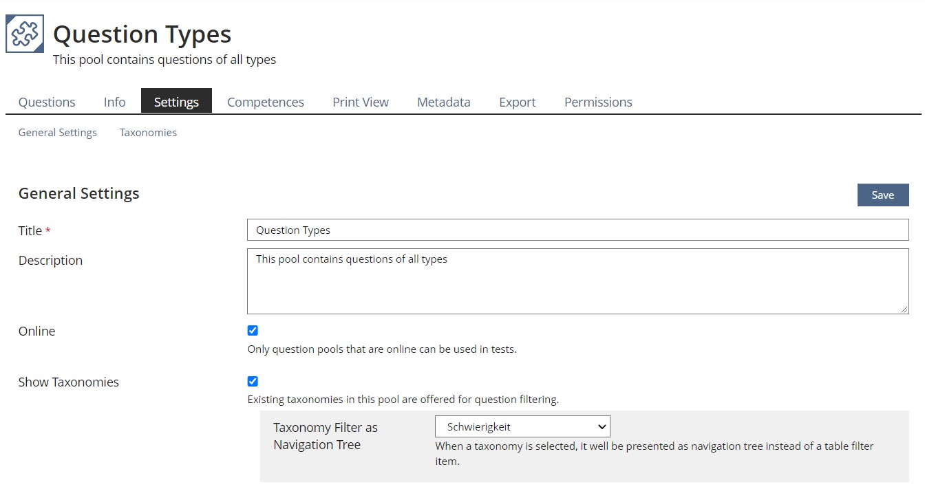 - In the tab Settings of Questions Pools the service Taxonomy does not require activation. However a setting concerning the presentation as a filter element is offered. Exactly one taxonomy can be set for presentation in the Tree View / Slate. This is removed accordingly from the filter and is only displayed in the slate.