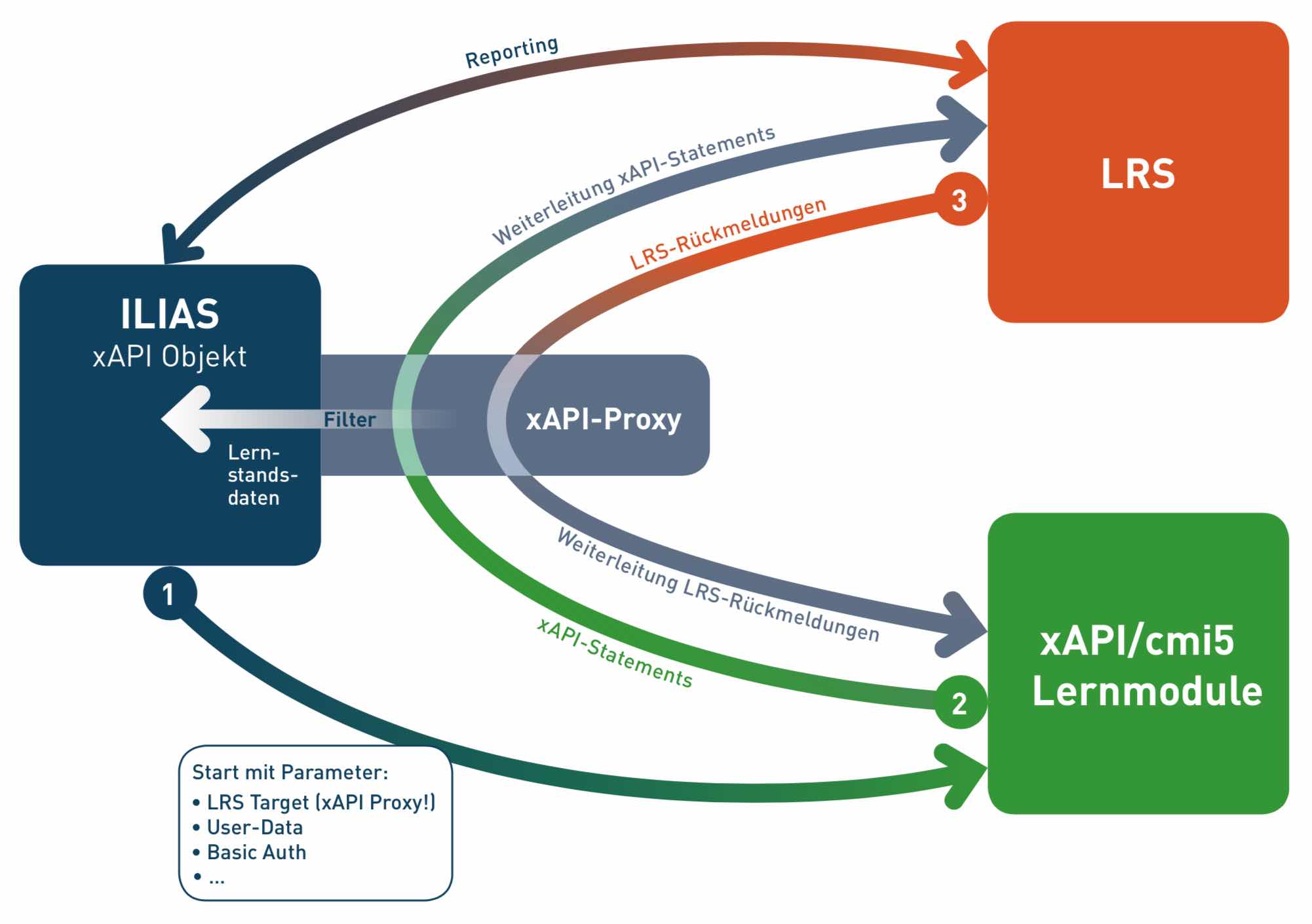 Die Anbindung des LRS geschieht in ILIAS über einen sogenannten Proxy. Dieser schaltet sich zwischen Lerninhalt in ILIAS und LRS. Auf dem Wege pseudonymisiert er den Datenfluss zum LRS bei Bedarf. In den Einstellungen von ILIAS ist es so möglich, das Senden des Namens und der E-Mail-Adresse von Lernenden zu verhindern. Stattdessen kann eine Kombination aus Benutzer-ID und einer eindeutigen ILIAS-Plattform-ID genutzt werden.
