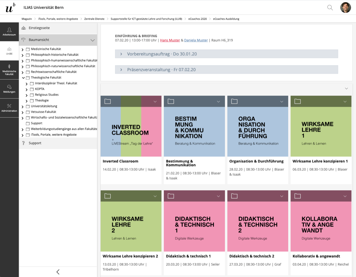Bezüglich Skin lässt sich mit wenigen Eingriffen Einiges erreichen. Als erstes geht es um das Farbkonzept. Wir haben bei uns ein sehr reduziertes Farbschema gewählt, das sich an das CI der Universität Bern anlehnt. Ziel war es, dass die Inhalte der Nutzer*innen mehr in den Vordergrund rücken, z.B. durch Bilder und Fotos in der Kachelansicht oder Texten in Lernmodulen. Diese sollten sich nicht mehr konkurrieren mit den Elementen, die ILIAS vorgibt. So haben wir auch die Buttons sehr zurückhaltend gestaltet, damit die eigentlichen Inhalte einer Seite (Objekte, Tabellen, etc.) in den Vordergrund rücken.