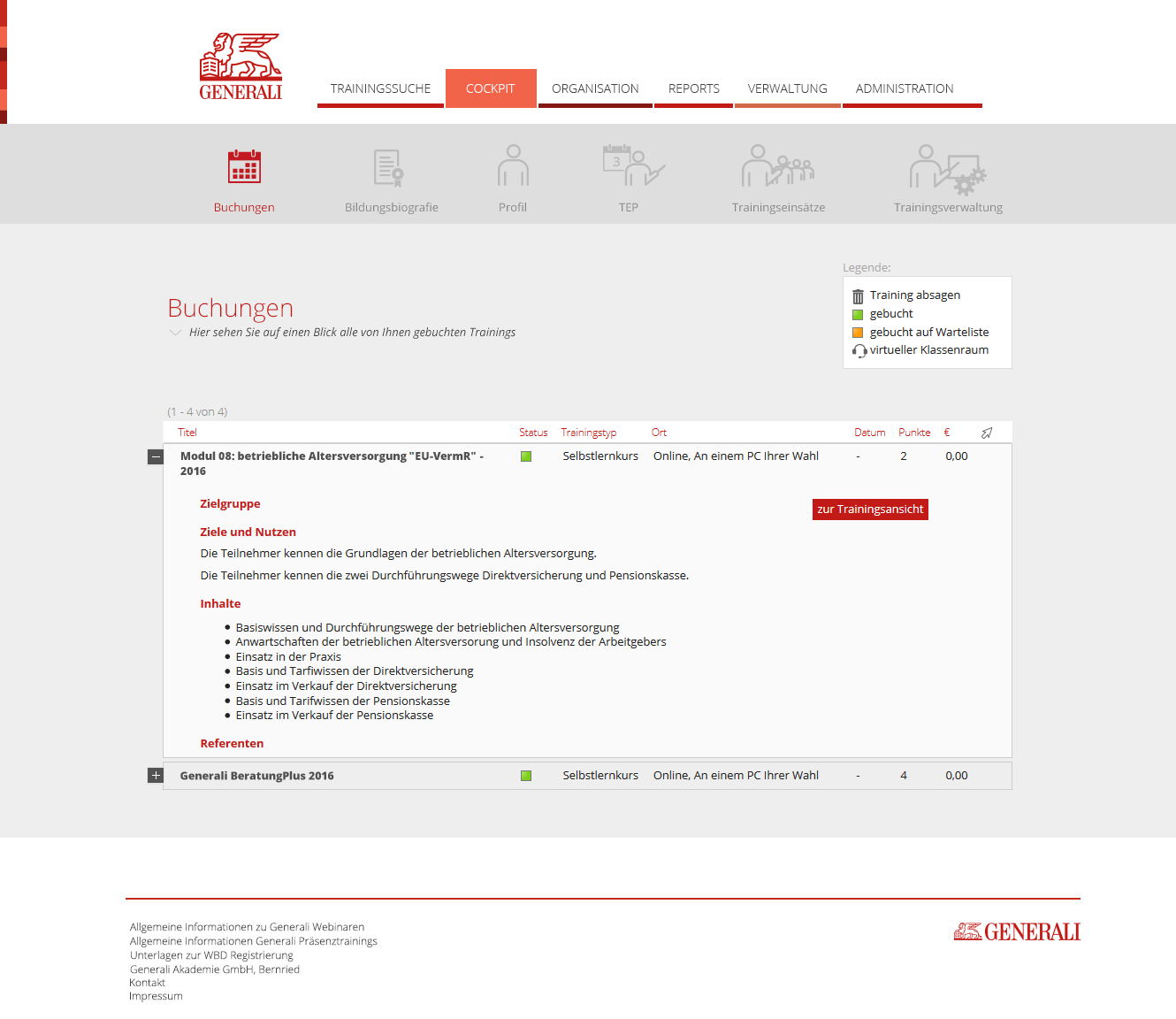 The ILIAS-based Generali Online Academy today regulates Training Management for all distribution channels. This includes the following functions: