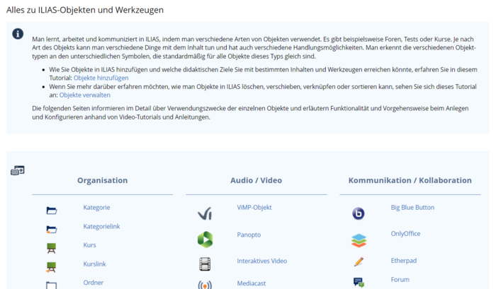 The University of Stuttgart’s ILIAS Toolbox focuses (as the name suggest) exclusively on ILIAS and not on other digital tools. The various ILIAS Objects and concrete usage possibilities for them are presented in learning modules with rather general categories names such as Evaluieren (evaluating) and Kommunizieren (communicating). The Toolbox has a CC BY licence and can therefore be used and adapted in accordance with the licence.