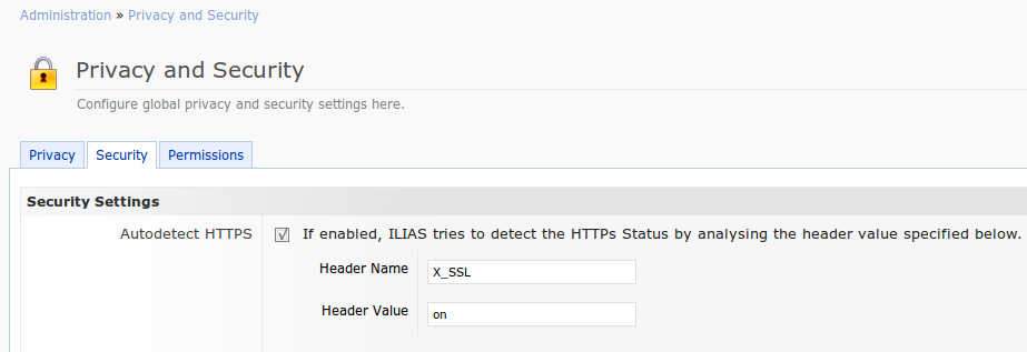 Therefore the name as well as the value of the header can be configured within the ILIAS administration under Security Settings (the header name is to be stored without the leading "HTTP_") Administration » Privacy and Security » Security » Autodetect HTTPS