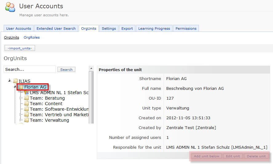 - Maintenance of organizational units in the ILIAS administration (separate dialogue)
