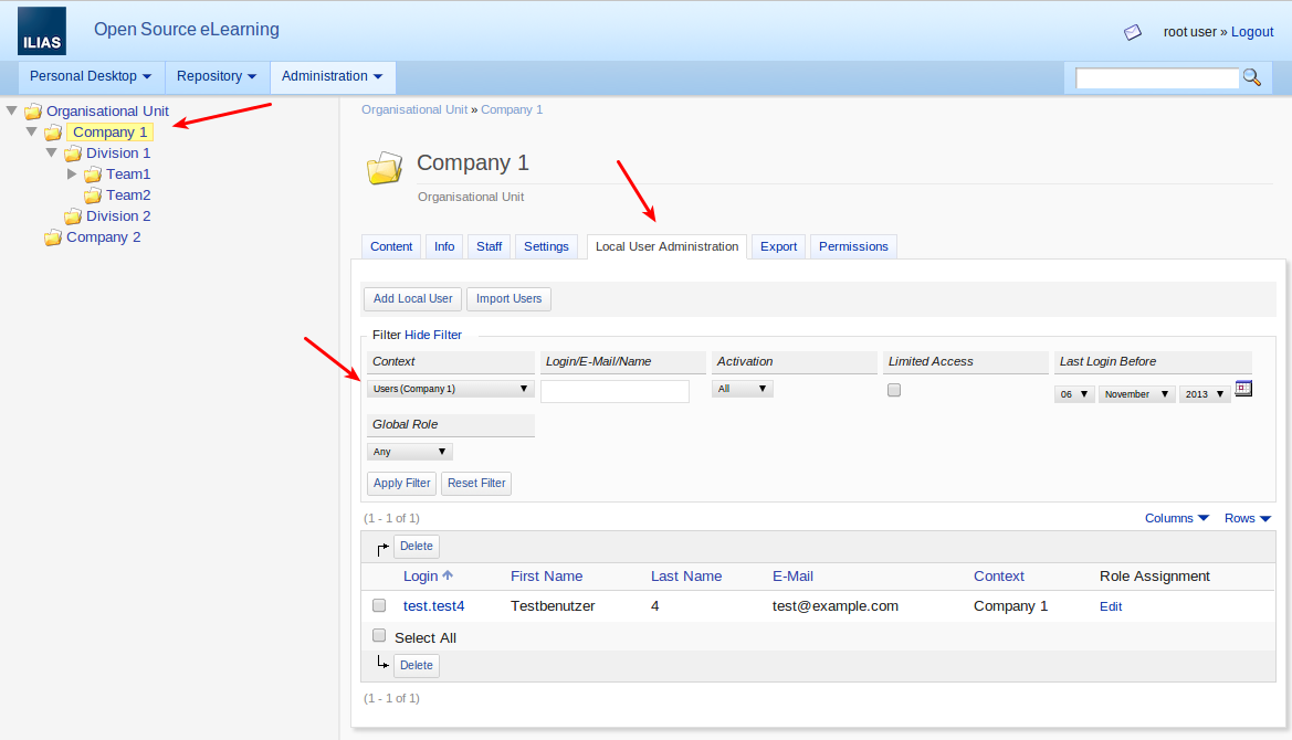 - Navigate to OrgUnit "Company 2" and then choose "Local User Administration".