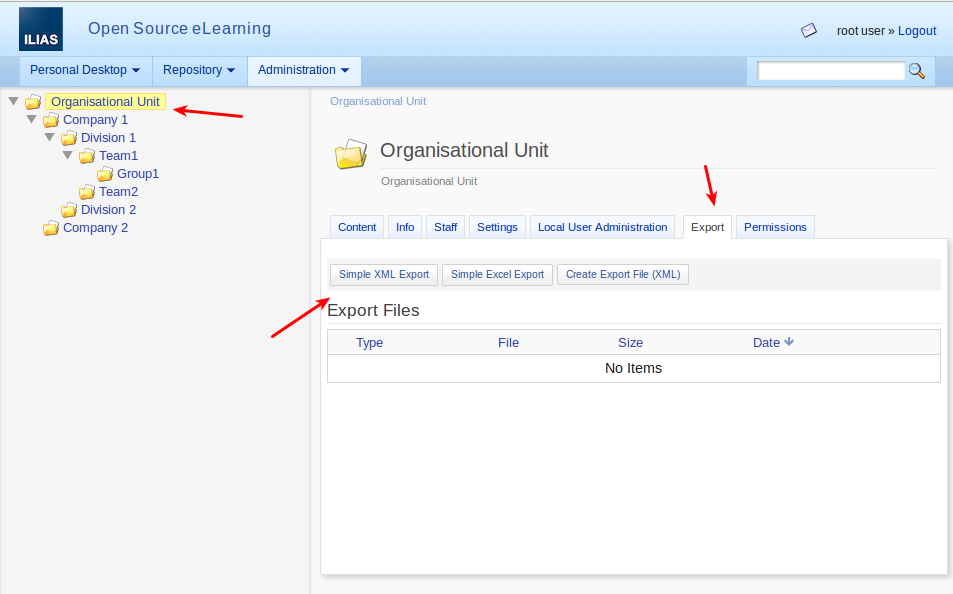 - Click on the Root node "Organisational Unit" and select "Export".