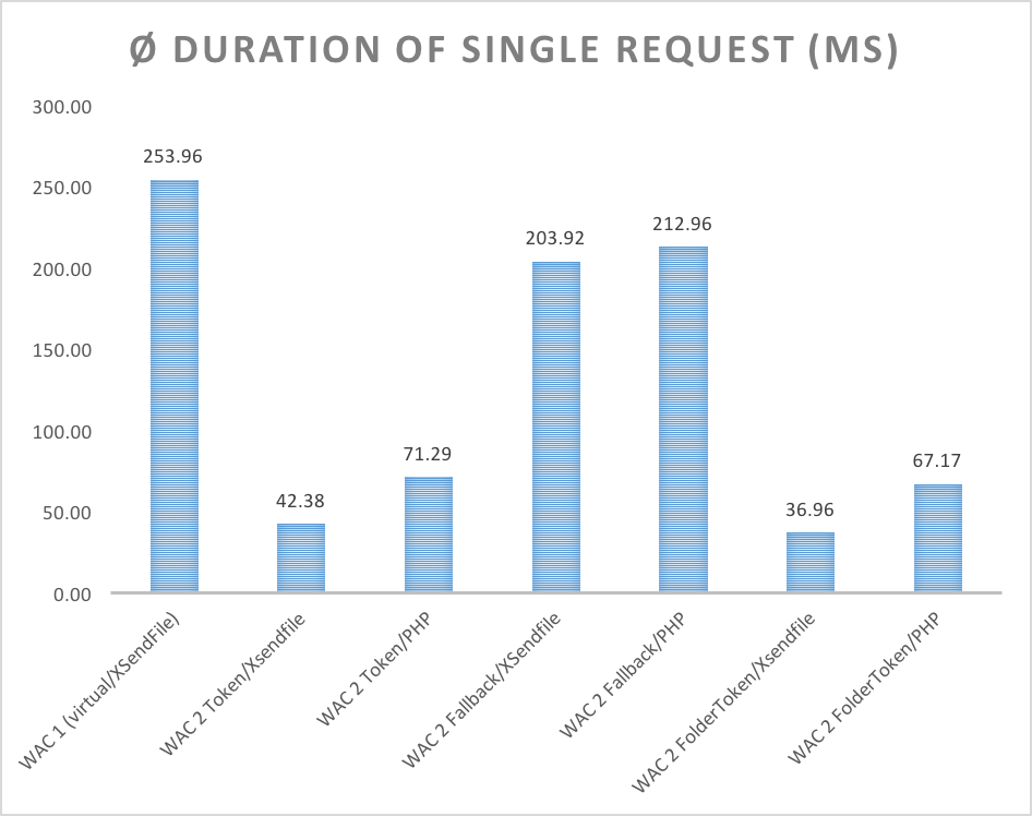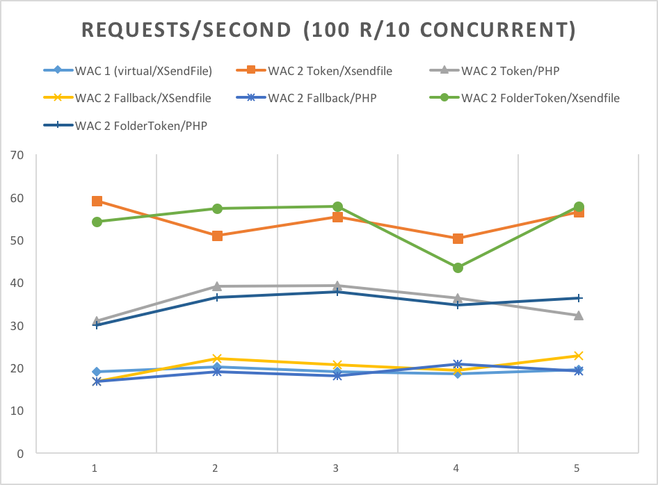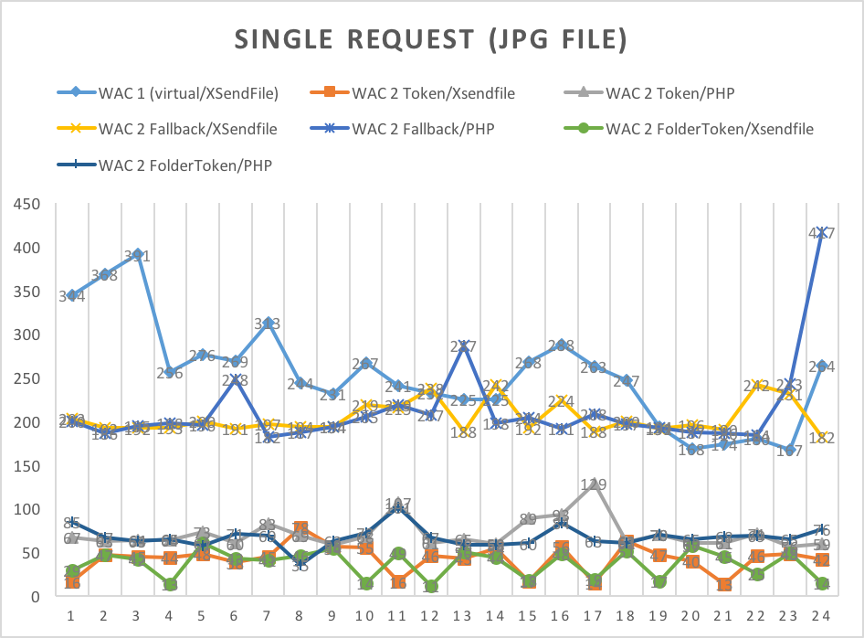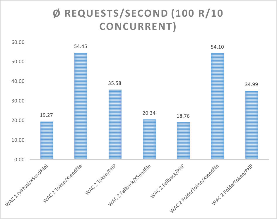 The following grafics show the performance-gain of the new implementation (token-based, fallback with checking-instance) and php vs. X-SendFile-Delivery: