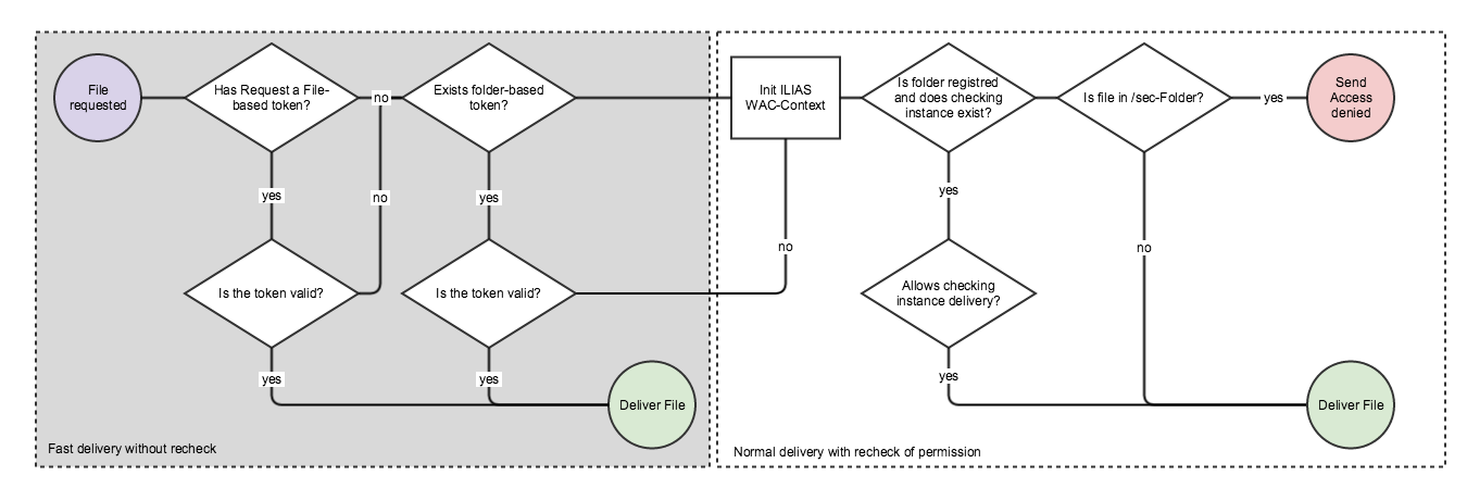 As in the grafical representation of the workflow in the next chapter, the fasted way to deliver files is token based. with a token based delivery no instance of ILIAS has to be initialized, such a request is up to 5x faster than with the initialization of ILIAS. therefore the WAC should have the possibility wo access the SALT without initialize ILIAS. If the SALT is in the "Data Directory outside Webspace" a.k.a "iliasdata", at least the ilias.ini.php has to be read by the WAC to determine the path of the iliasdata-directory. This is an additional request couses some additional execution time. alternatively the salt-file could be stored in the "Data Directory in Webspace" a.k.a "data". When using a .php file with a variable-declaration in it, this is not e security-risk and additionally, bytecode compiler can store the file. both variants (A: using iliasdata-directory and read ilias.ini.php, B: using data-directory and include .php-salt-file) compared in duration: