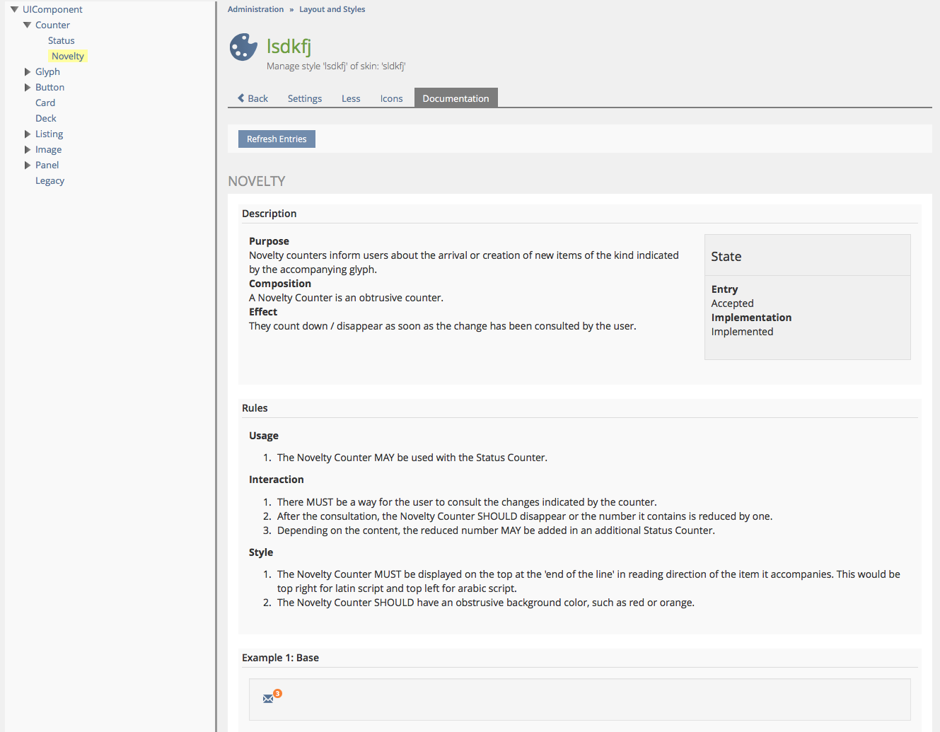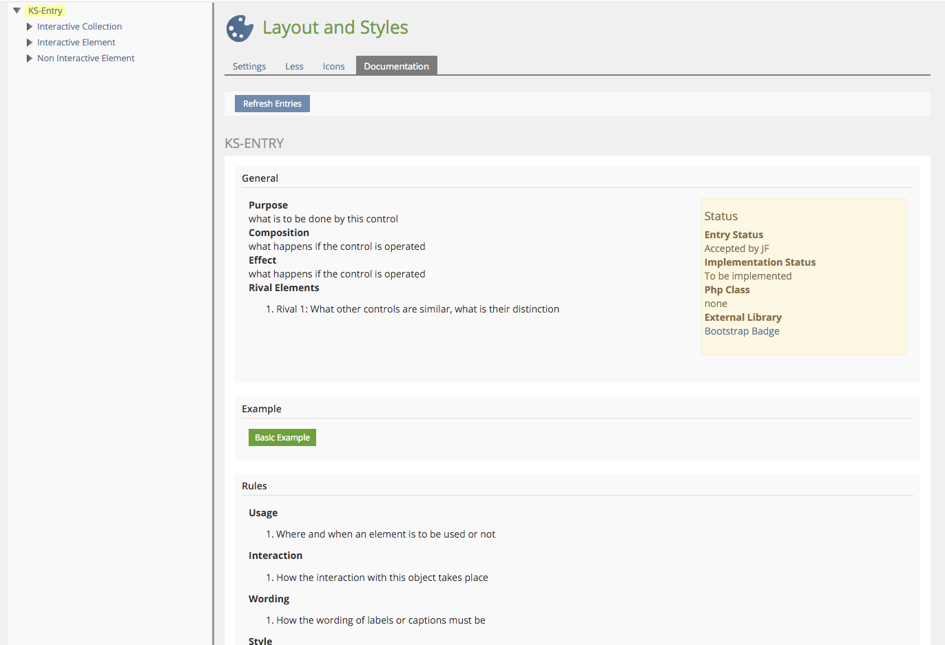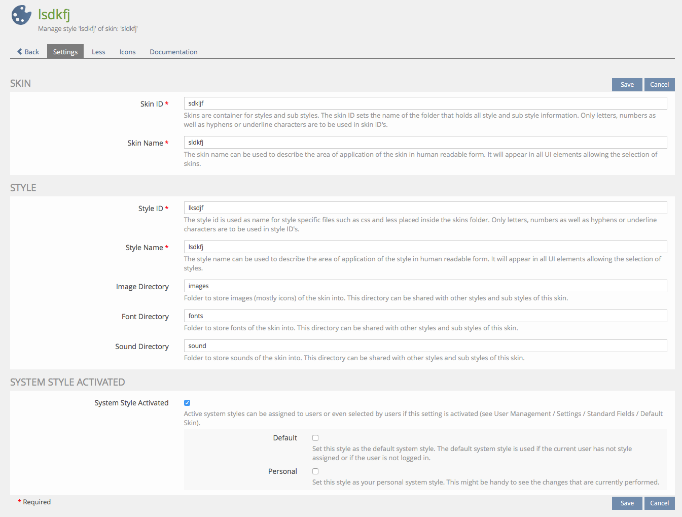 The new subsection has the Tabs "Settings", "Less", "Icons" and "Documentation". It still caries the title of the System Style in focuswith the matching Icon (see behaviour in 'Content Styless').