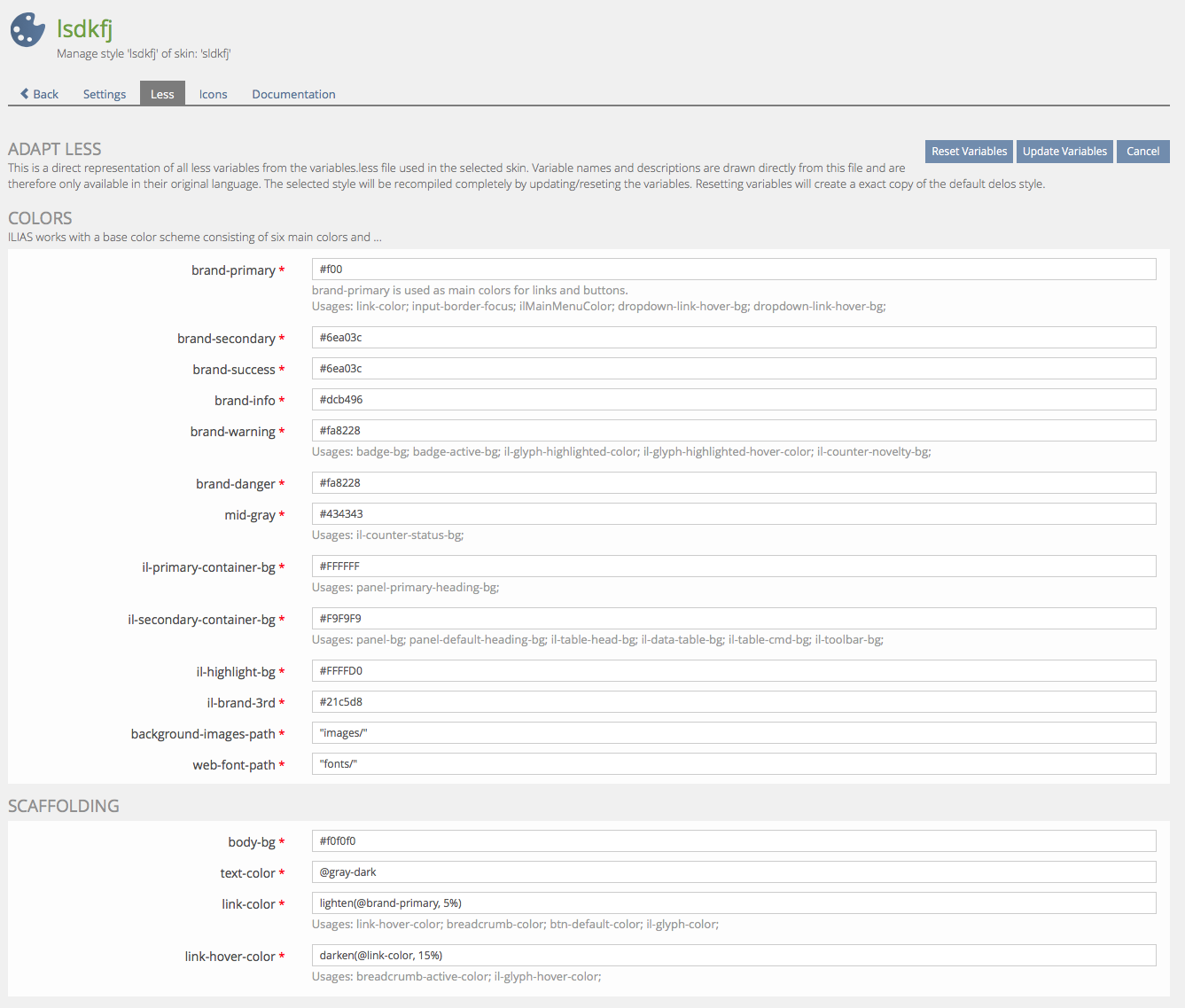 - The style contains a variable.less file that is included in the main less file of the style (named: myStyleName.less).