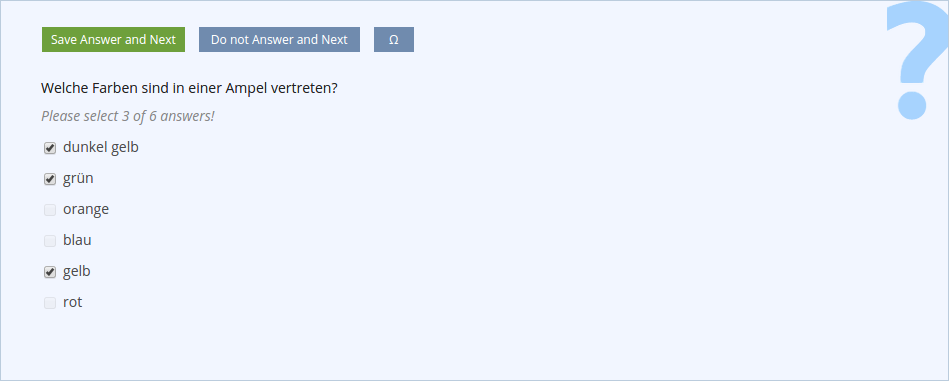From the learners perspective, when the feature is activated, the number of selectboxes is checked by JavaScript. Once the maximum number of selections is made, the remaining checkboxes are deactivated, "greyed out". In order to select a different checkbox, another one must be deselected first.
