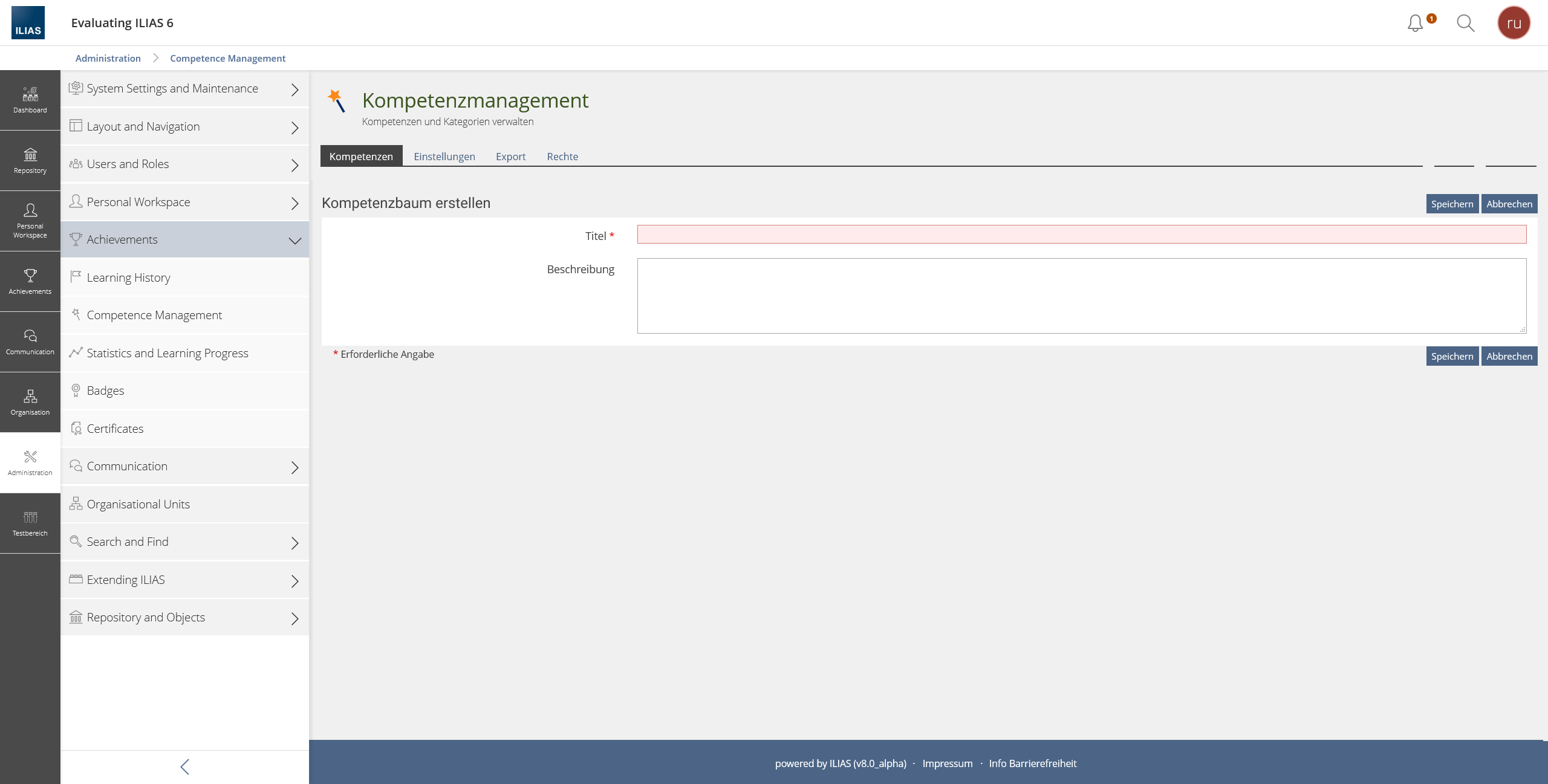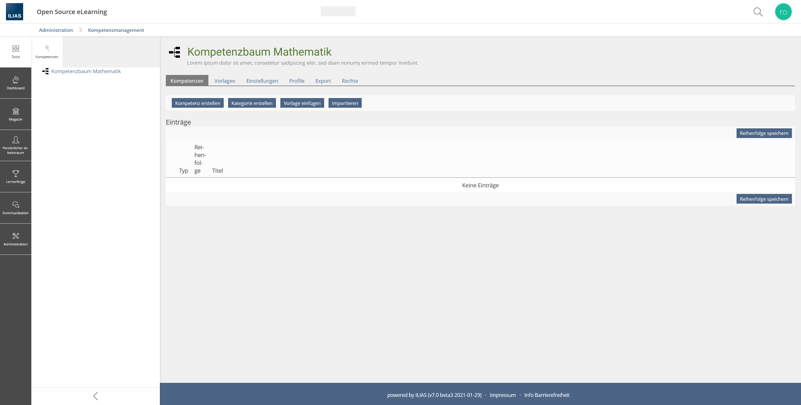 Zenzen, Enrico [ezenzen], 17 MAR 2021: Due to technical issues the feauture had to be revised. We still want to be able to use rights to control who can manage competences in individual areas. Accordingly, a new top level note "Competence Tree" is introduced. Access to the competence tree can be configured via rights.