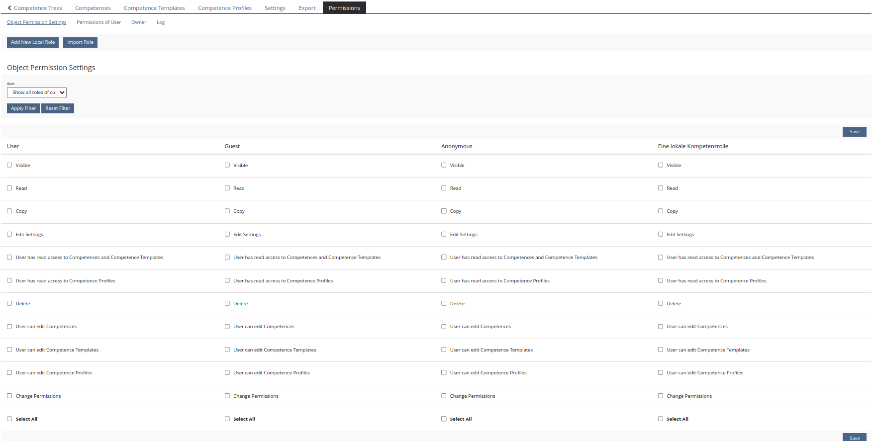 Competence categories get their own tab 'Permissions'. In the 'Permissions'-tab local roles can be created, roles can be imported, global roles can be assigned permissions. The Permissions are