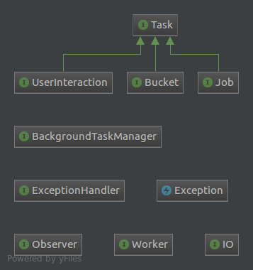 - I am not sure i understand the "User Interaction". Is it that a Task that requires information from the user? Or is it that the user gets access to the result of a task? Is this really the same? Could be benefitial to make a distinction between those two. This also seems to be a bit mixed up with these IO-classes.