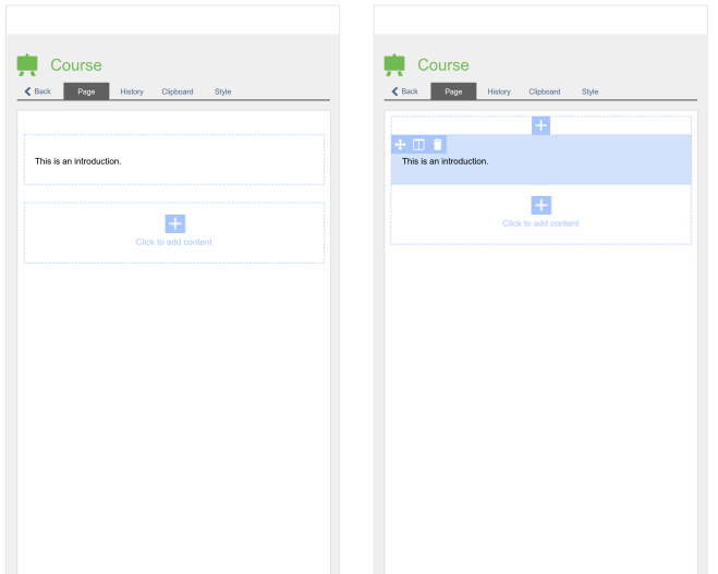 - Users can add more content elements with the add-new-content-glyph (+) above or below an existing block.