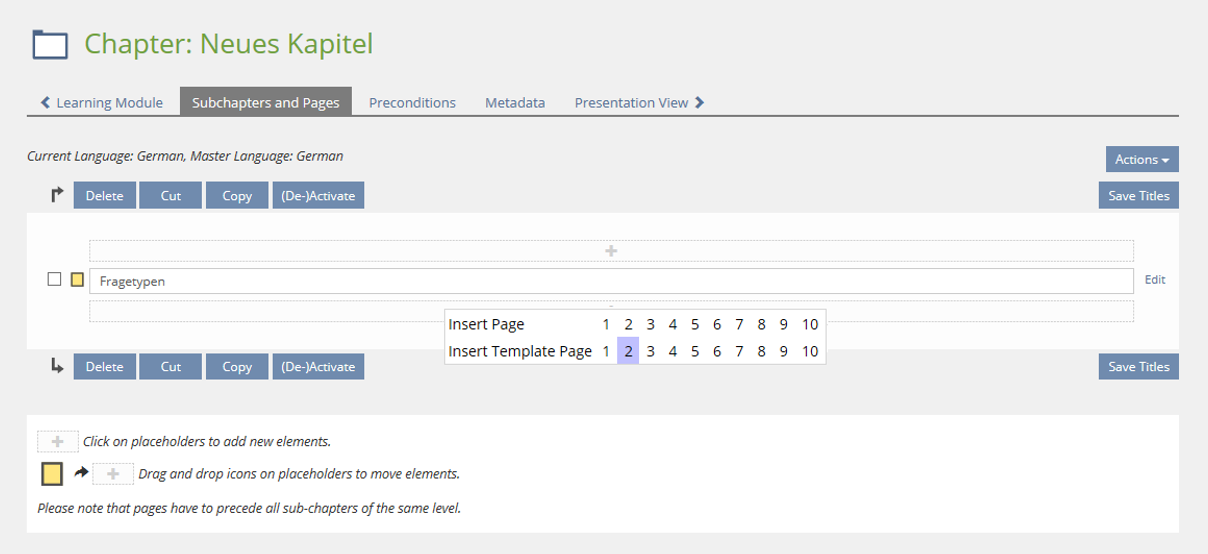 For reasons of uniformity, the click paths and screens are based on working with page templates in portfolios. Page templates should be able to be used in an ILIAS learning module as follows.