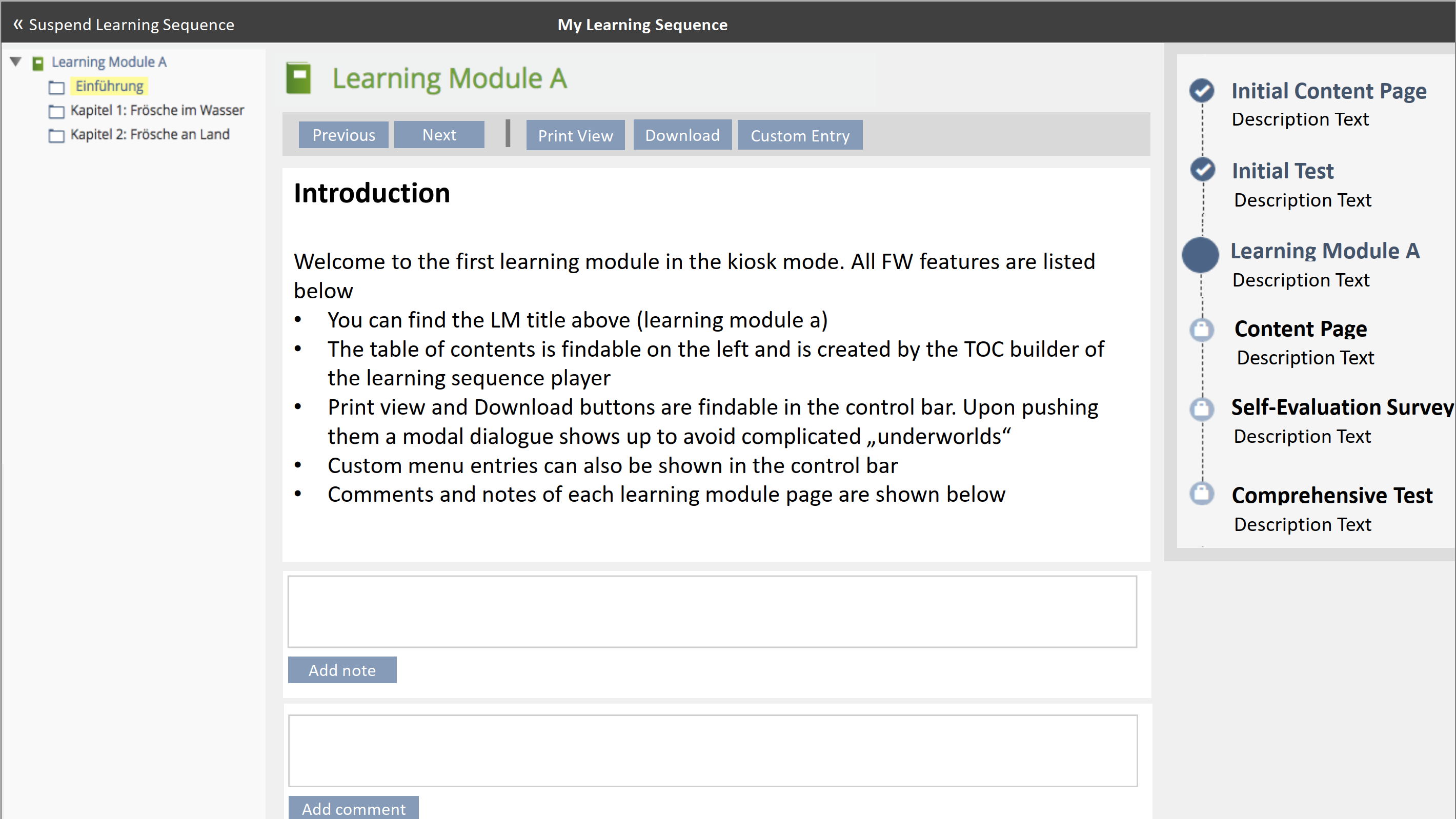 Table of contents / tree structure of learning module | yes | LM uses TOC builder of learning sequence player (even progress icons are already supported by TOC builder), displayed on left side (or in slate). A page of its own as it is in the LM is not desired. |
