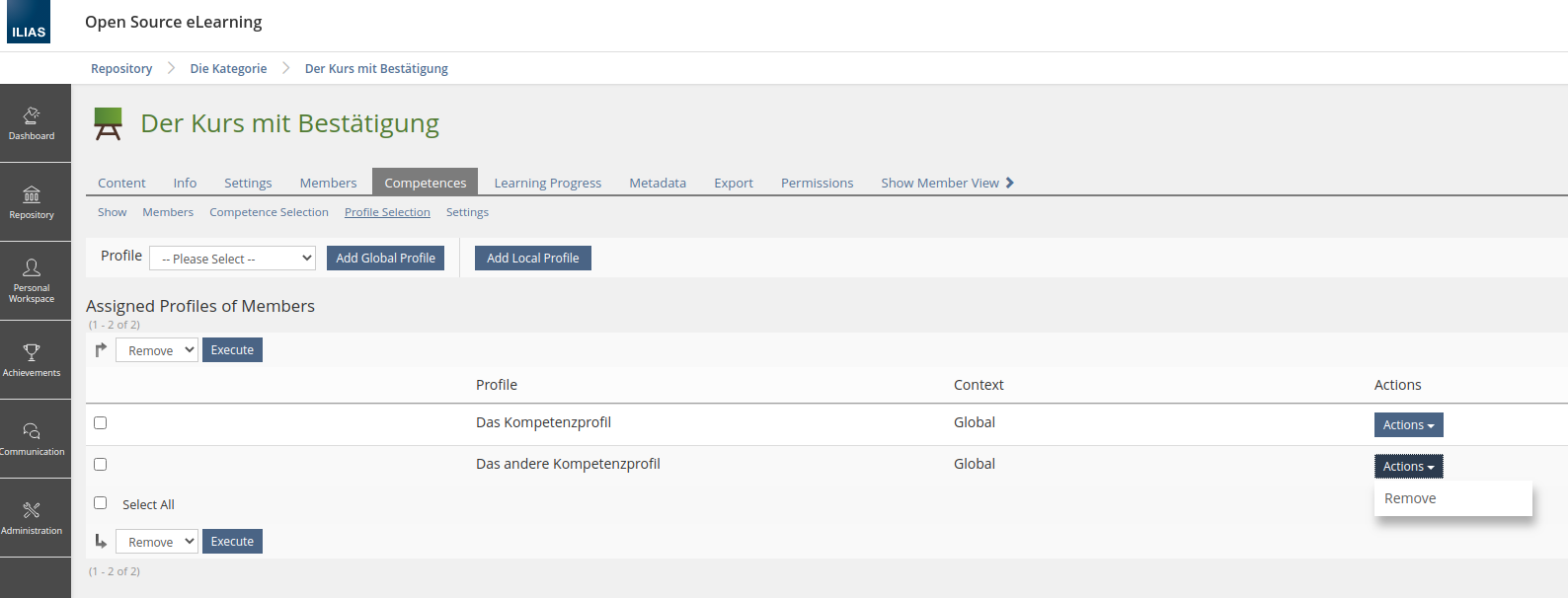 Course / group admins should get the chance to select / deselect one or more existing global competence profiles to the current course / group by selecting it from the list of all existing competence profiles.