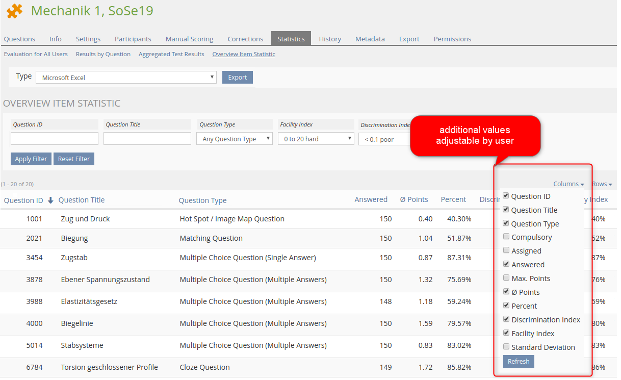 An overview in table form presents the desired statistic (like in survey). The sortable default values are: ID, Title, Type, Answered, Ø Points, Percent, Discrimination Index, Facility Index