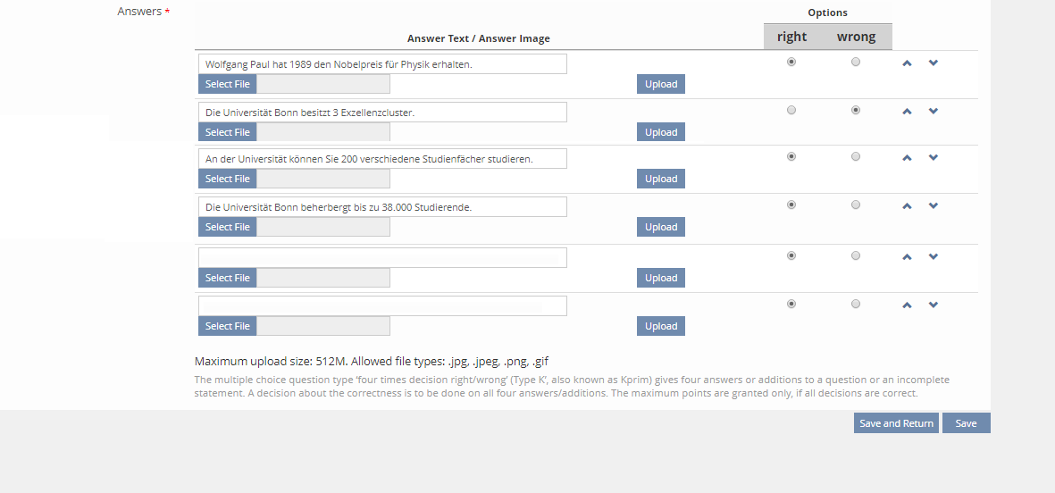 The import and evaluation of up to six answer options has to be assured. Additionally the user inteface allows to configute up to six "Answer Text / Answer Image"