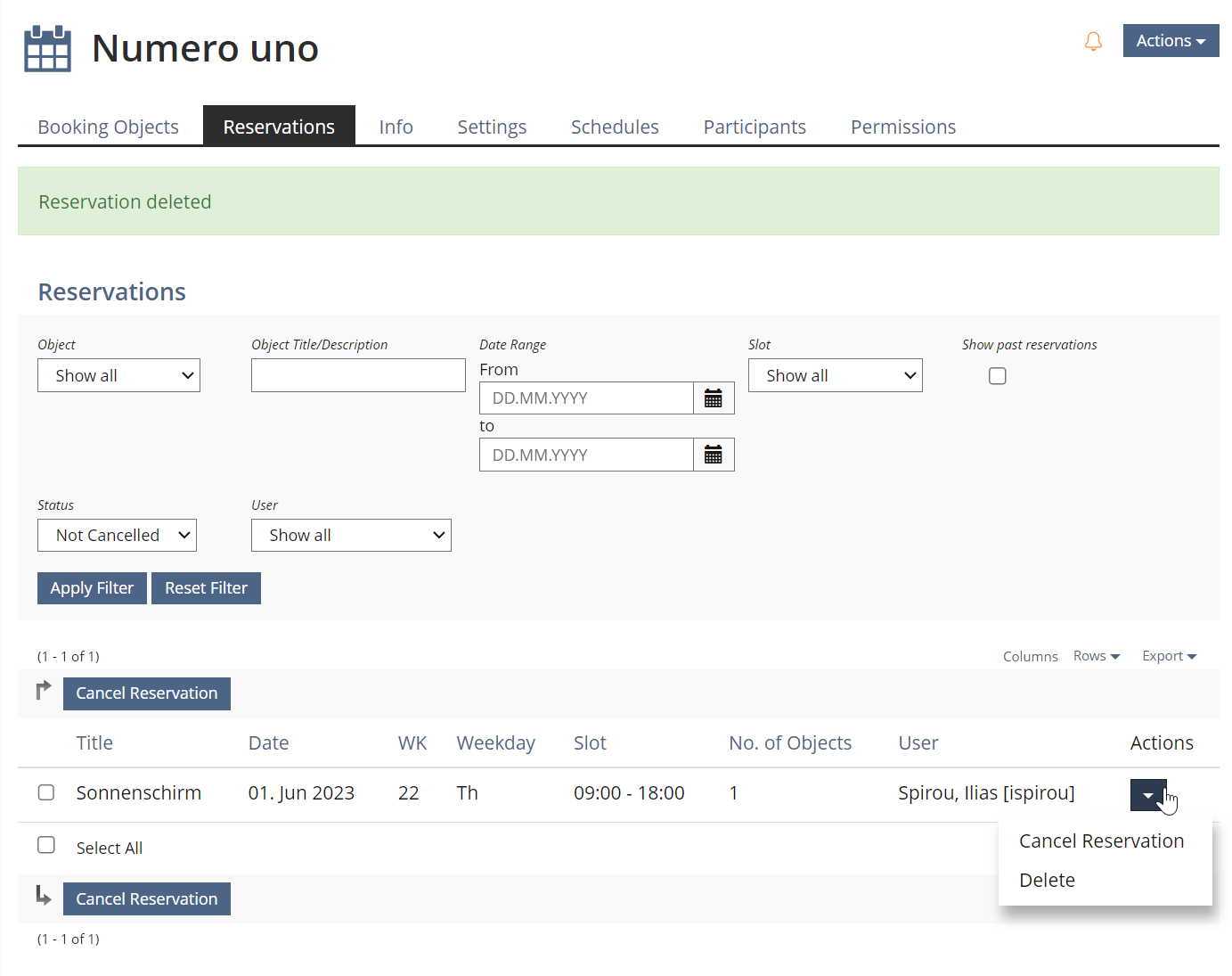 In the column Actions on the "Reservations"-tab an action menu is introduced. The action menu contains the entries "Cancel Reservation", "Delete" and "Post Booking Information". This makes it easier for users to find the information.