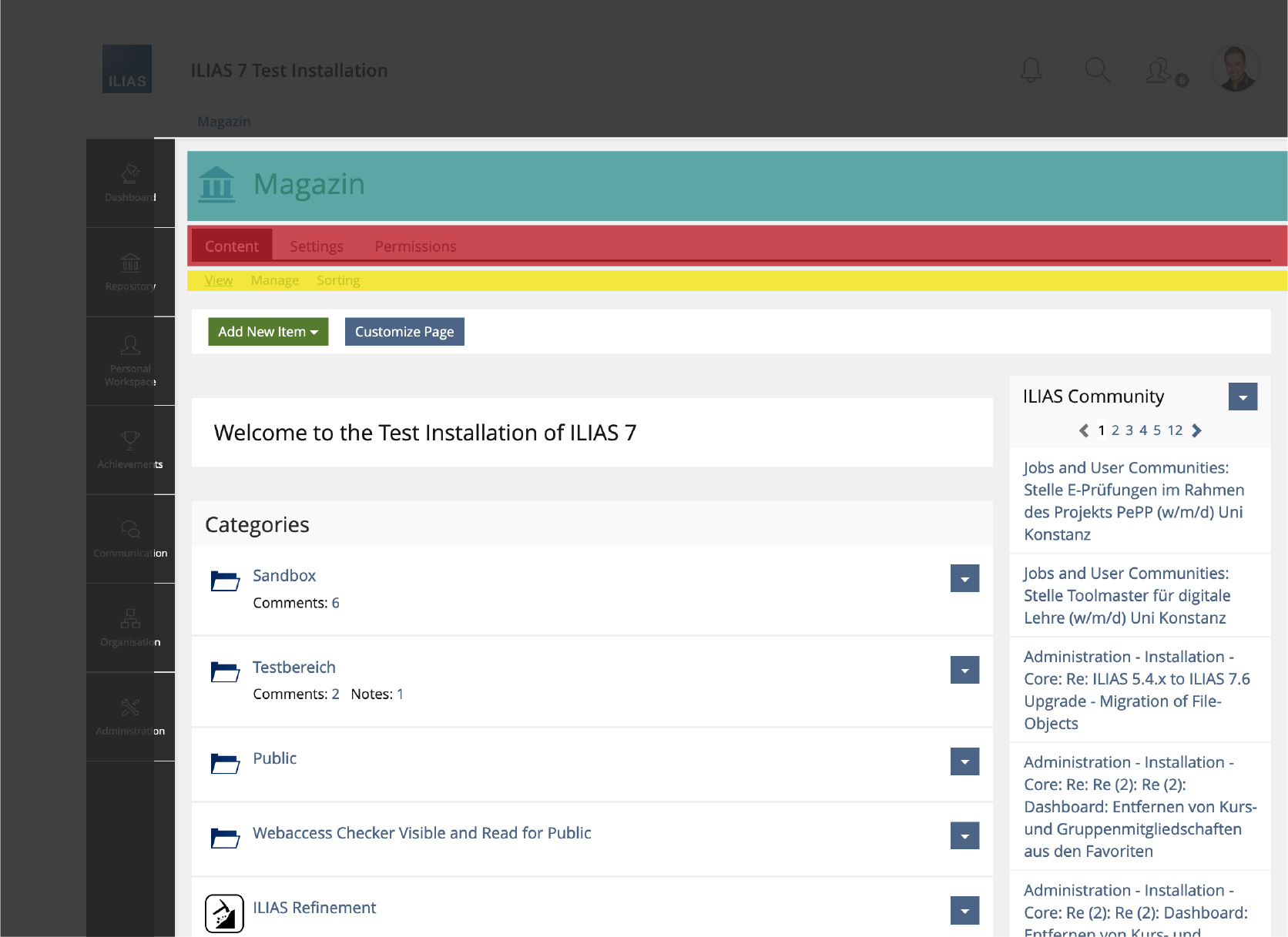 ILIAS knows already things like views, e.g. in the screenshot below we see the "View" of the "Content" of the "Repository". ("Thing" -> Tab -> Subtab). Besides Tabs and subtabs we sometime see things like the so called "Unterwelten", which are basicly subviews of a view. We can have a look at views as a tree. This is what we would like to have a closer look at and build up a nre concept.