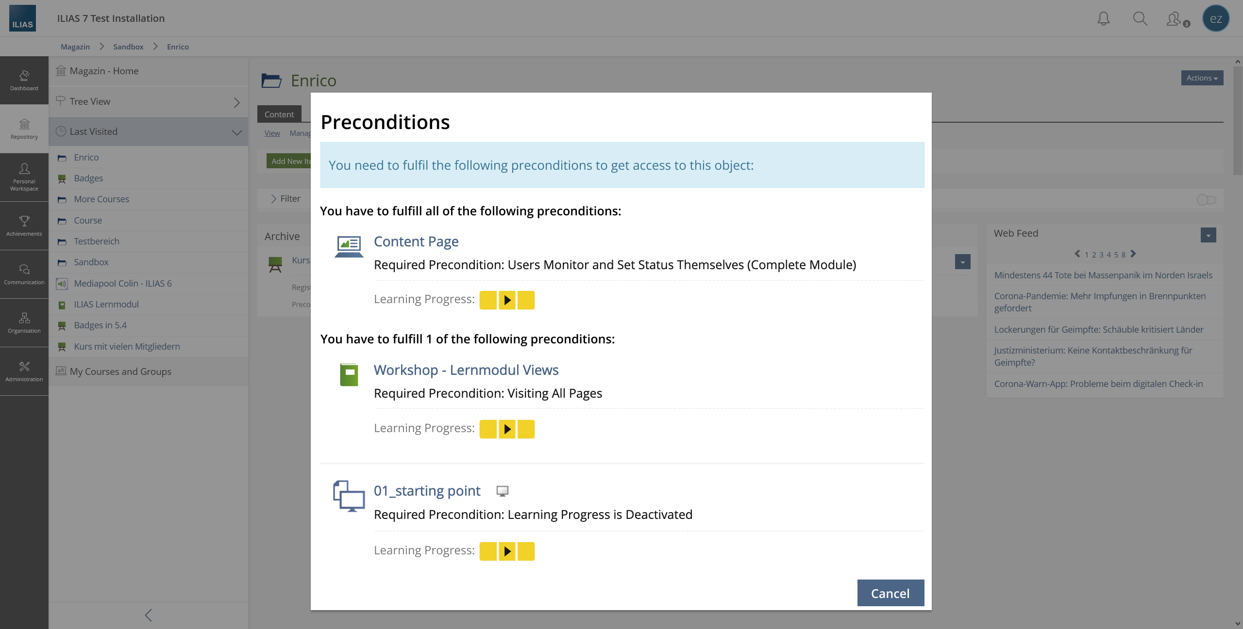JourFixe, ILIAS [jourfixe], 20 MAR 2023: We highly appreciate this suggestion and schedule the feature for ILIAS 9. The final implementation might be a bit different from the proposals above due to possible changes of the way how properties will be displayed in the future within the Standard Listing Panel. There is no need to list the number of preconditions (see suggestion by Matthias).
