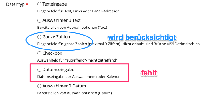 Valid fields would have to be expanded or entries of the type "date entry" would also have to be taken into regard: