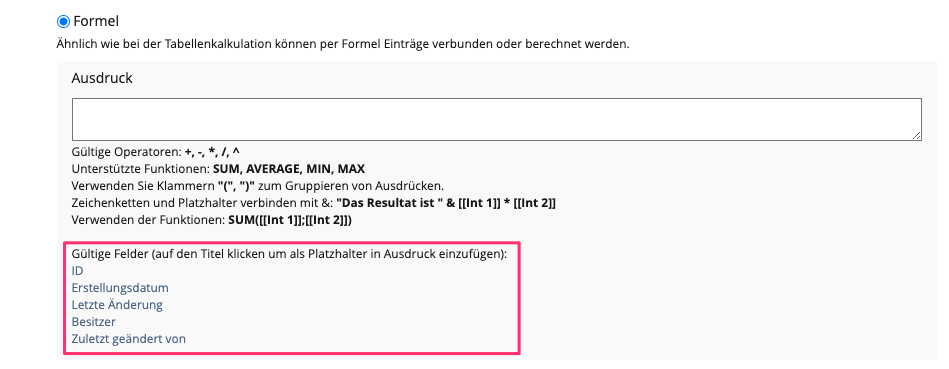 The formula field should be extended so that Date entries can also be integrated. That means, for the valid fields, the entries of the type "Date Entry" should also be regarded and be listed. Currently, only entries of type Integer (int) can be selected for calculation, this has to be extended with entries of type Date Entry (datetime).