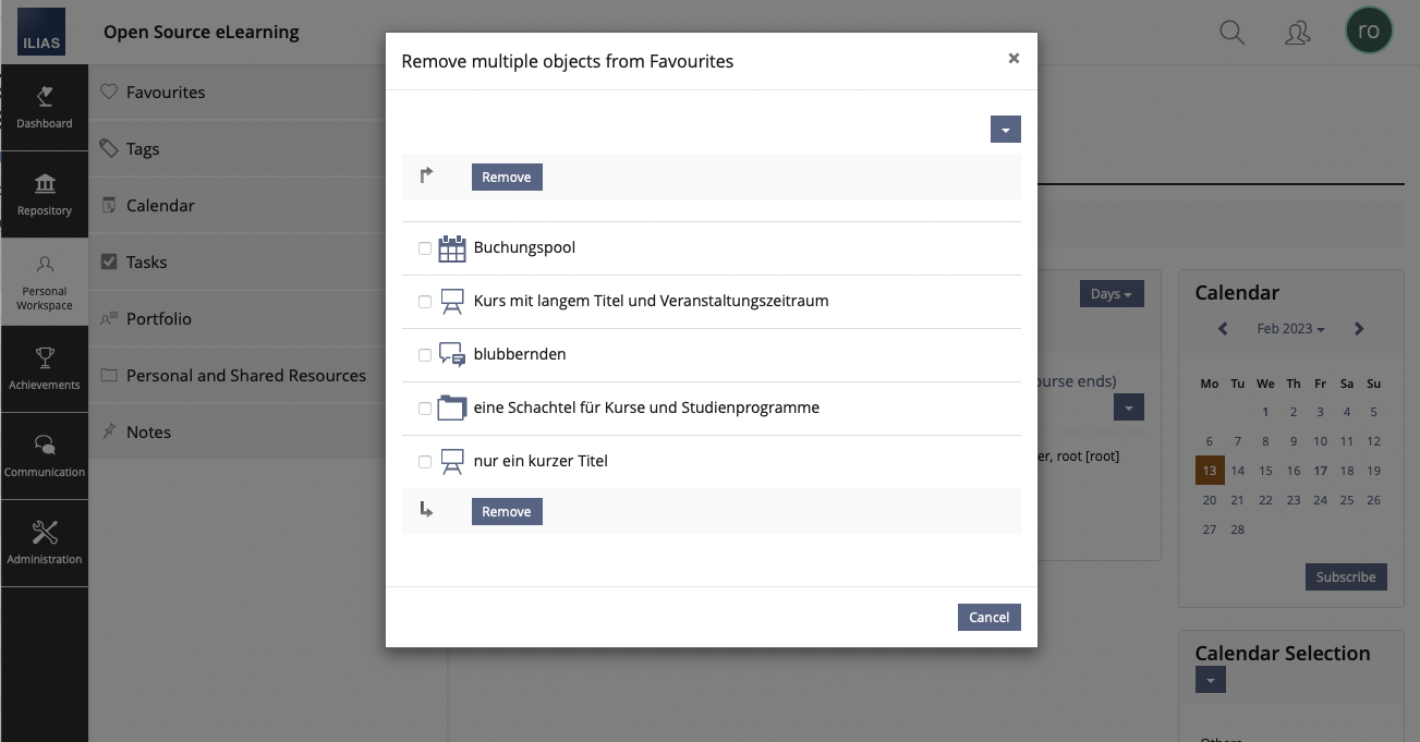 DevIssue 1) Process of removing multiple objects or membershipsFor a) 'Favourites' and b) 'Recommended Content', the action menu offers an option to 'remove multiple objects'. For c) 'My Course and Groups' and d) 'Learning Sequences', the action menu offers an option to 'unsubscribe multiple'. Both processes for all four dashboard section are identical in their operation.