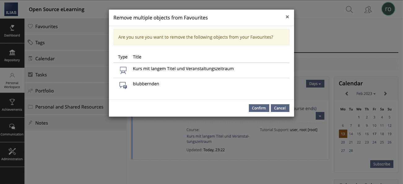 For a more modern design and to keep the context from where the action is called, we would like to run these two-step processes in a roundtrip modal. Possible contexts from where the dialogue could be called up are a) the dashboard, b) the own view of My Courses and Groups and c) the Favourites in the slate.