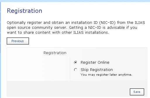 Optionally you can register your ILIAS installation. This is not a requirement to run ILIAS, but here you can show the ILIAS community that you are present. A big number of ILIAS installation may attract other people to use ILIAS an may help in the ILIAS development.