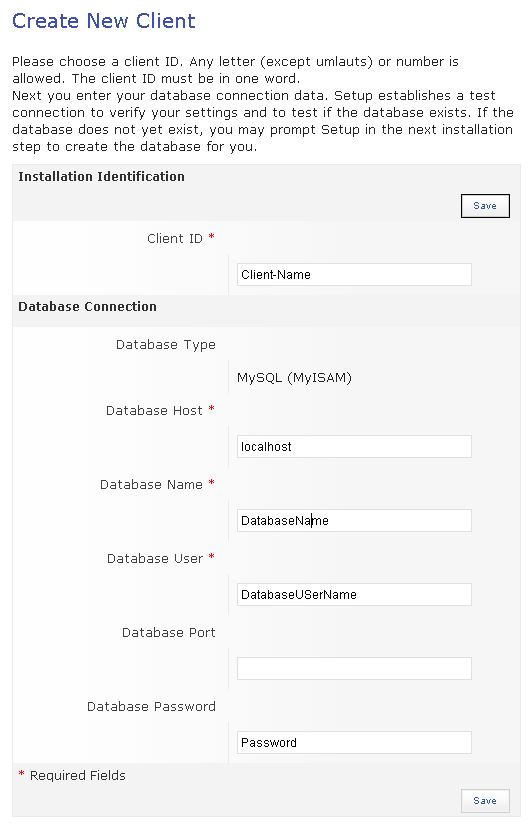 The next step configures the client name and database access settings. You have to provide your settings used in the "database" chapter for a successful installation, the screenshot below shows only dummy values