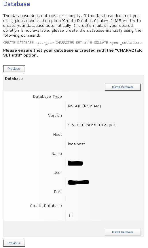 If needed, ILIAS setup creates a new database and the required tables for this client. To create the database, the database engine root credentilas have to be supplied.