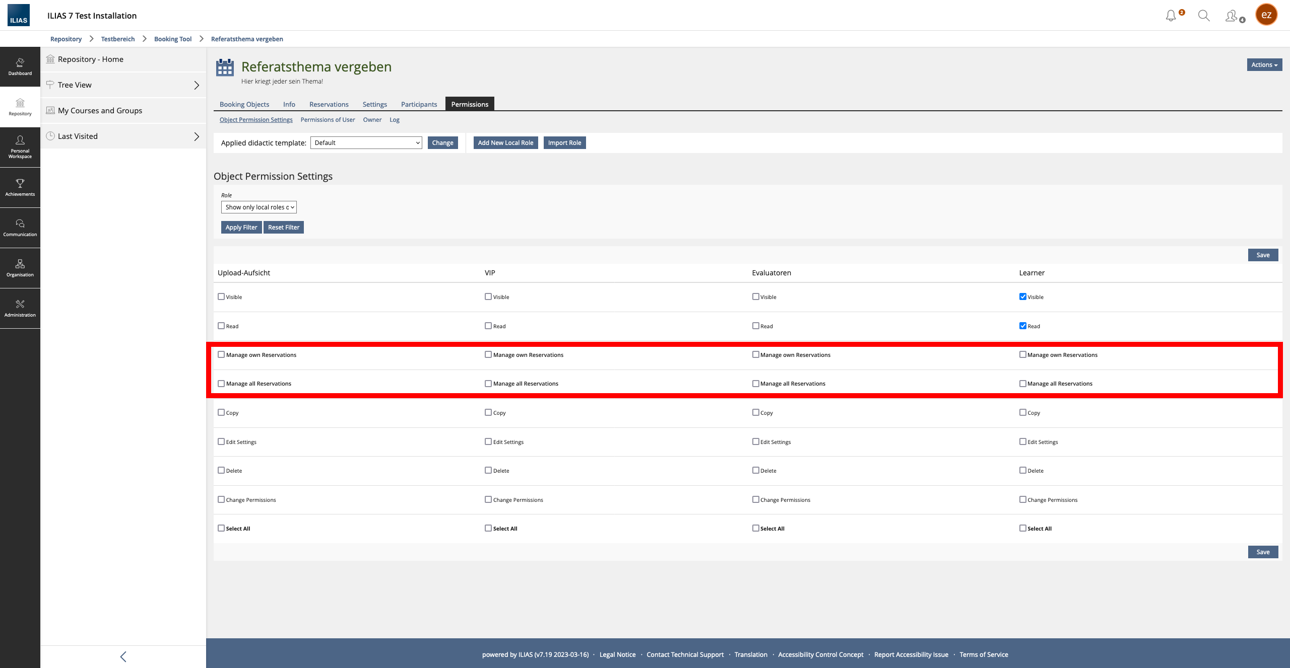 - The permission "Manage own Reservations" is to be introduced. Topics, rooms or times should only be assigned by tutors or course admins, this permission controls whether a role e.g. course members can book booking objects and delete or cancel reservations their own reservations.
