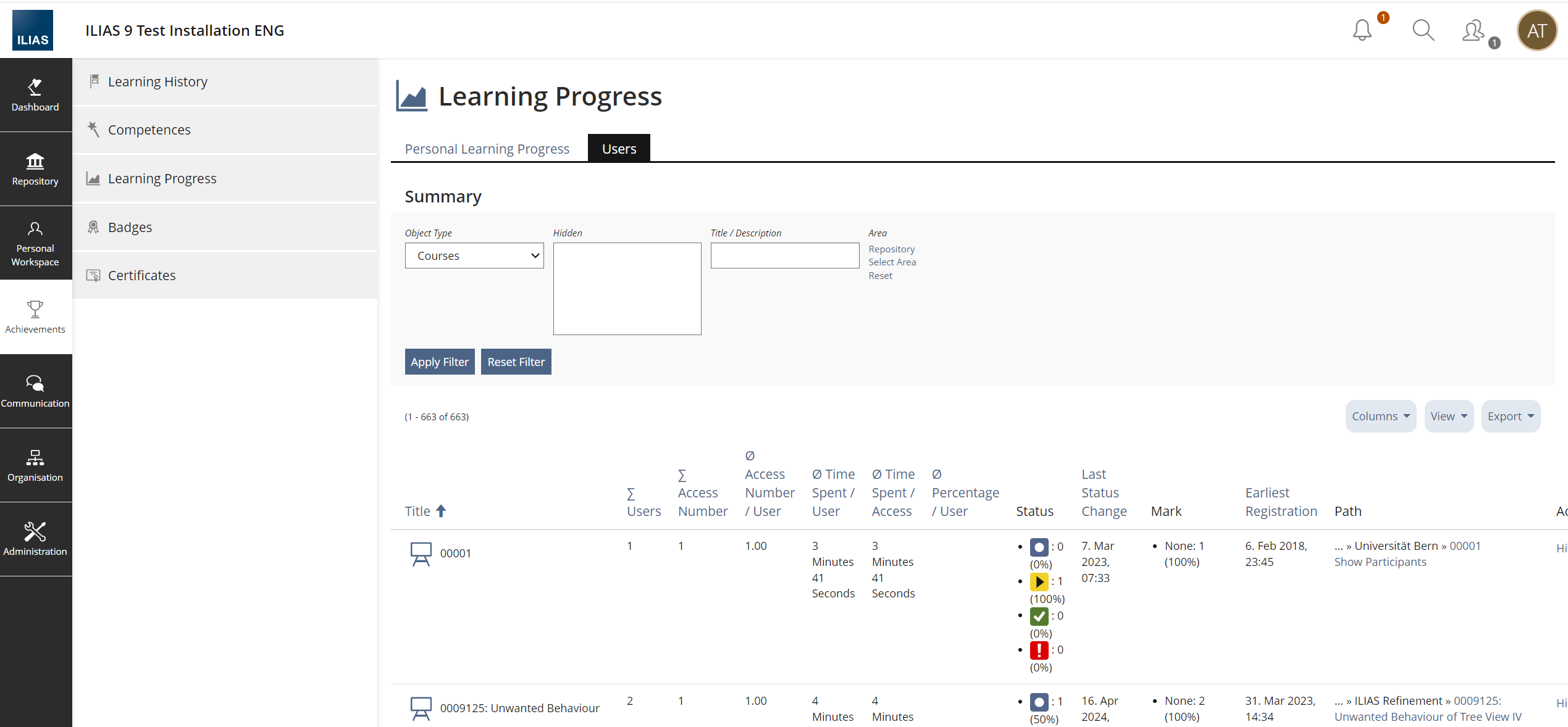 The Main Bar entry Achievements > Learning Progress shows two tabs to those who have access to the Learning Progress of other users in objects in the Repository.